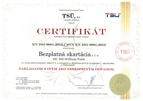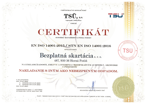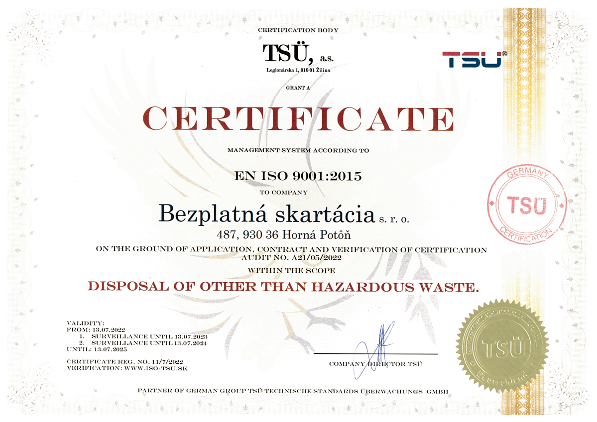 Naša spoločnosť sa riadi platnou legislatívou, dodržiava všeobecne platné legislatívne zákony dané štátom a disponuje platnými povoleniami potrebnými na poskytované skartačné služby.